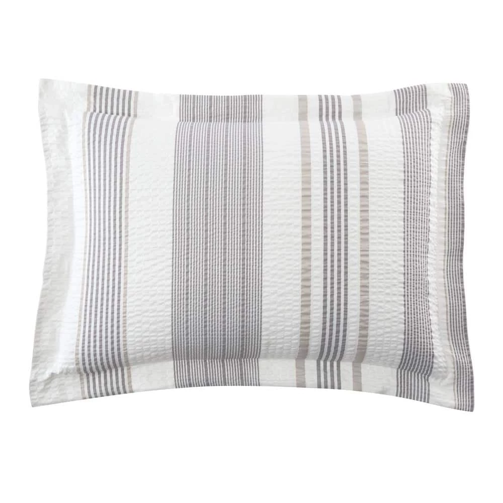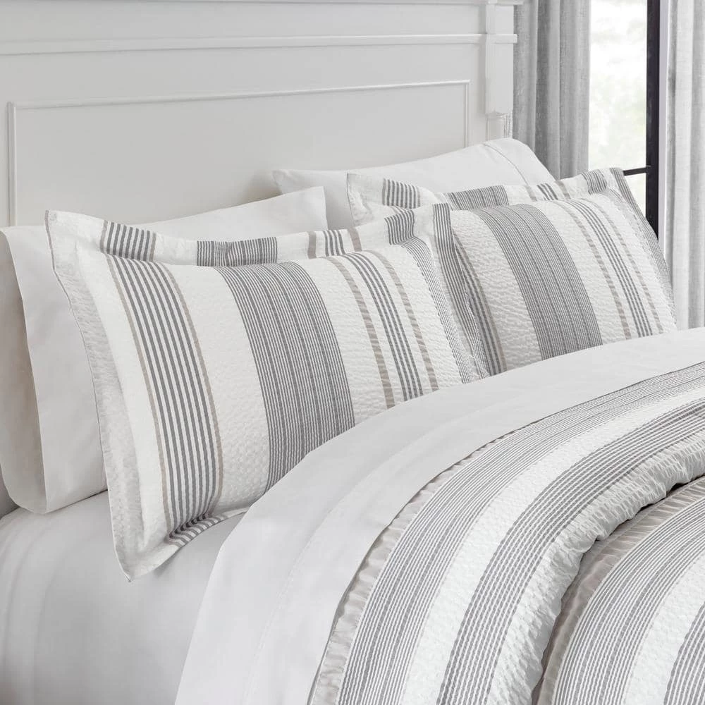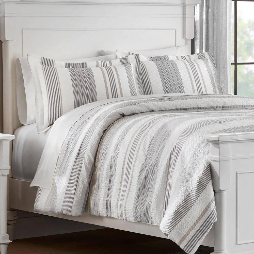 Bring a timeless look to your bedroom’s decor with the Home Decorators Collection Arden 3-Piece White and Gray Textured Stripe Comforter Set. Featuring soft, neutral hued stripes over a white background, this comforter reverses to a solid white for a versatile look. The textured, yarn dye striped pattern adds a modern farmhouse element, offering the perfect touch for a comfy, cozy retreat. Two standard pillow shams and an ample comforter make it easy to set up your guest room or master bed, and the machine washable construction is effortless to maintain.