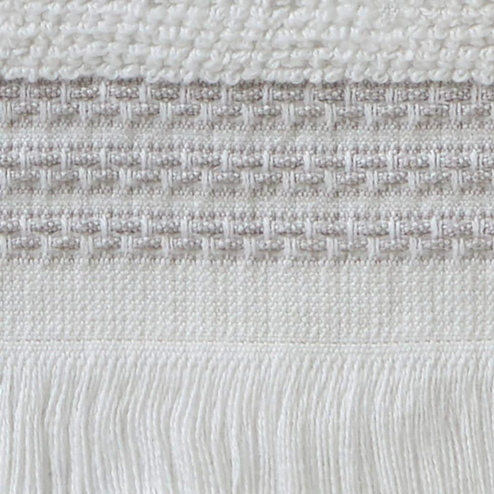 - Soft cotton terry with grey stripes, textured band and self fringe along hem