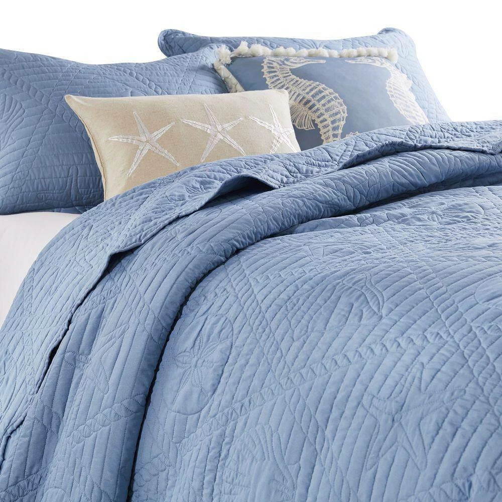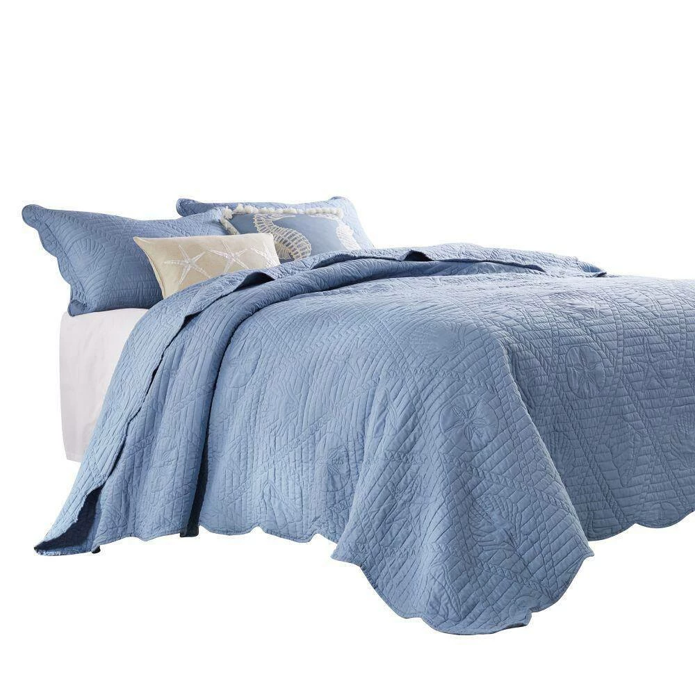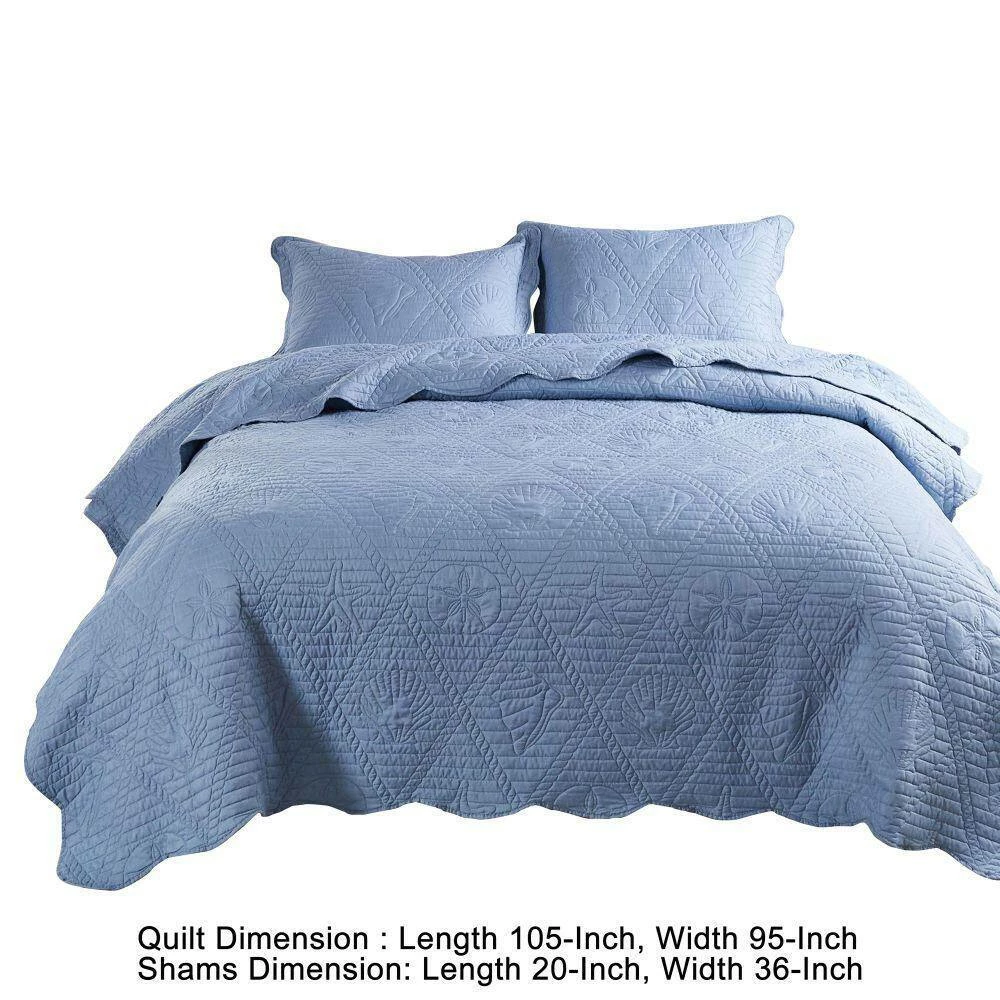 Decorate your bedroom in minimalist fashion with this 3-piece king size oversized quilt set, made of high quality microfiber with machine quilted starfish, sand dollars, conch shells, and rope designs with scalloped trim for an understated look. It is filled with cotton and polyester for a soft and smooth texture and is safe to toss in the washing machine for effortless upkeep on this comfortable companion to your bed. Check out our Esen collection for more sizes.
