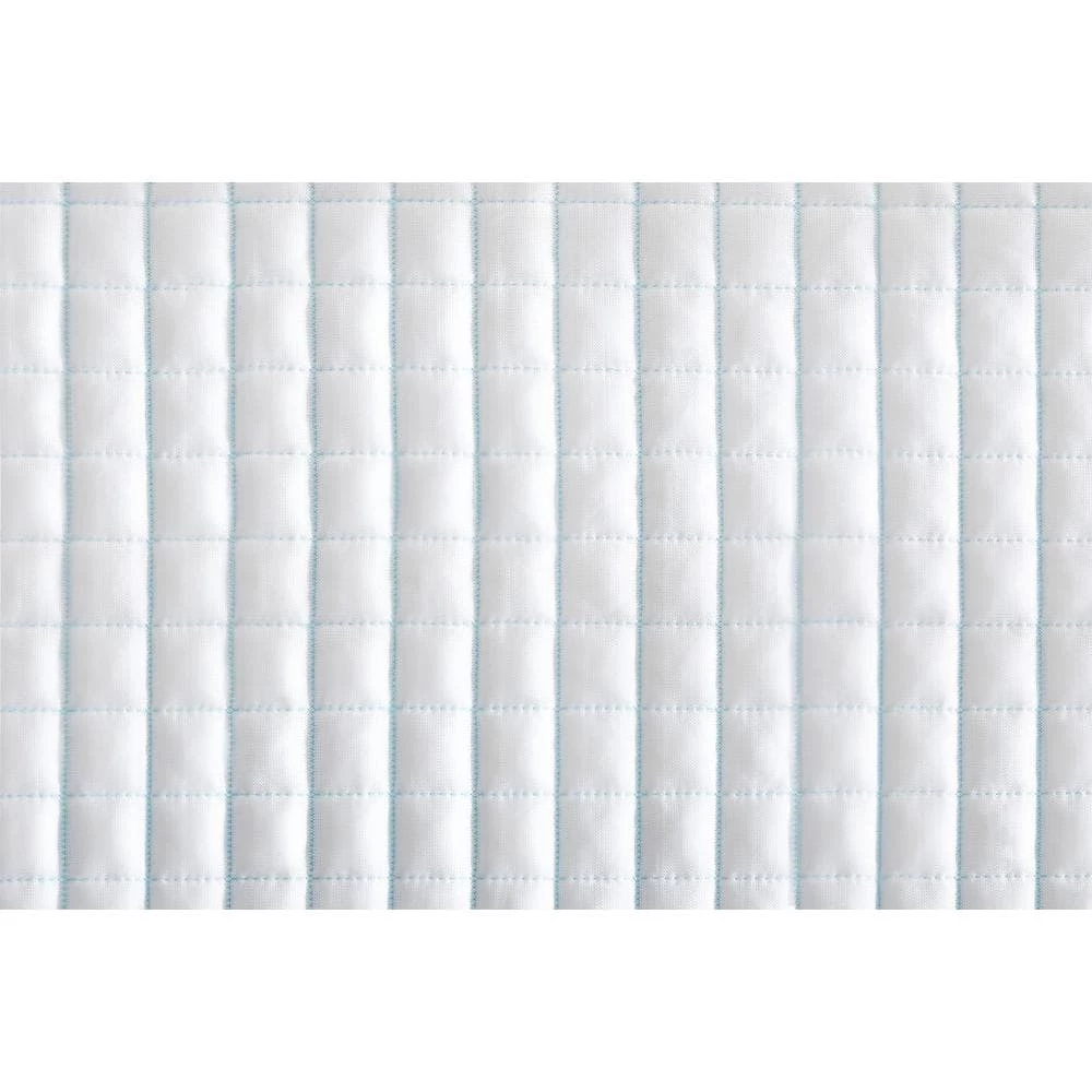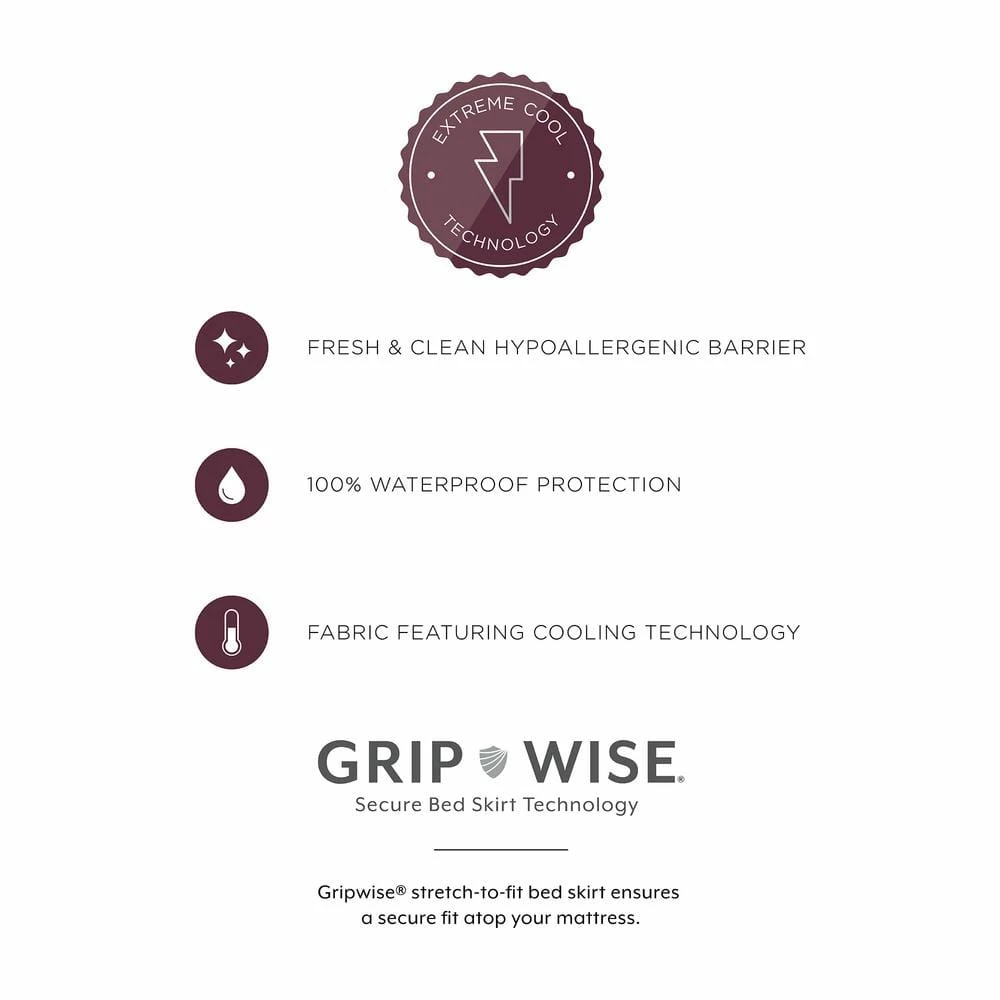 This mattress protector features technology in the fabric that creates a cool-to-touch feeling, quickly diverting heat away from the body when you get into bed. The mattress protector is also completely waterproof so your mattress stays safe from spills, keeping it clean and fresh. The Grip-wise stretch-to-fit bedskirt envelops your mattress for a secure and snug fit to keep the protector in place, fitting up to an 18 in. D mattress. We’ve also added blue sating cording around the mattress protector for a luxurious look. Machine washable for easy cleaning.