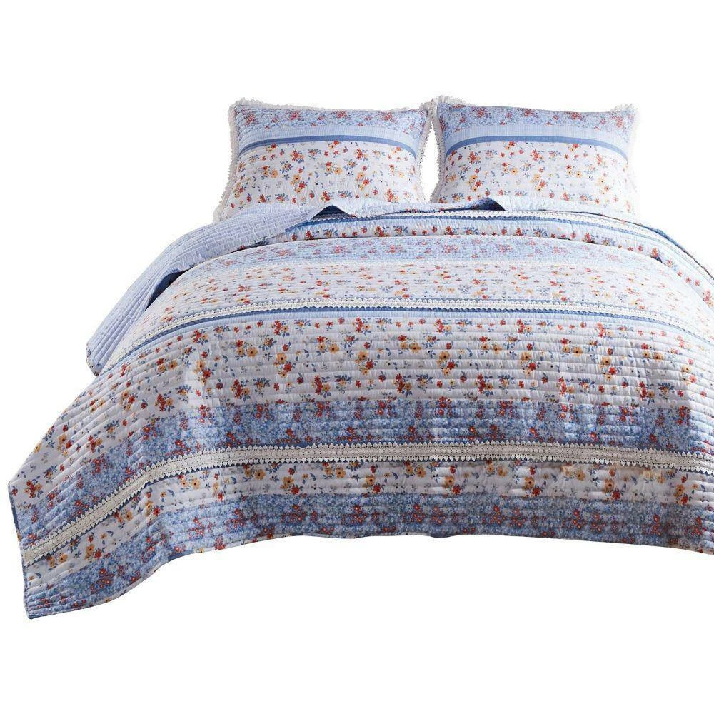 With a vibrant multi tone blue and white finish, this 3 piece king quilt set enlivens the aesthetic of your master or guest bedroom. Depicting an elegant floral print with soft lace trim, it is crafted from ultra soft brushed microfiber. Featuring 2 pillow shams, it is machine quilted with fabric bound edges. Check out our Joa collection for more options.