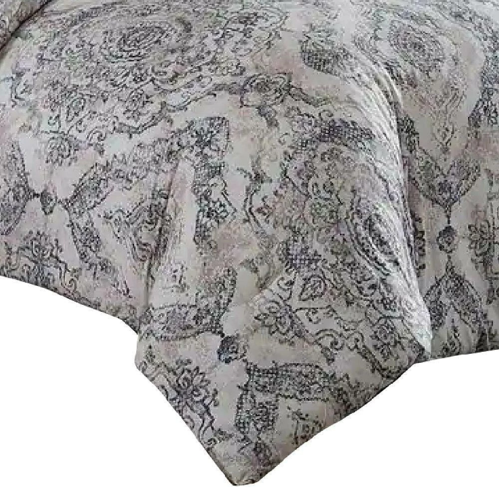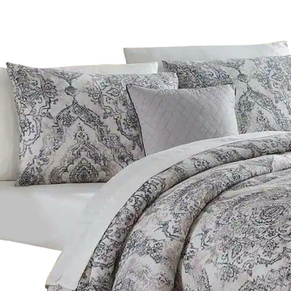 - One queen comforter, two shams, one fitted, one flat, one throw pillow, and two pillow case