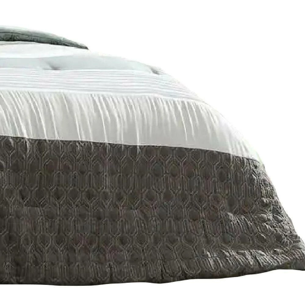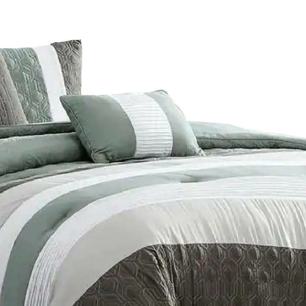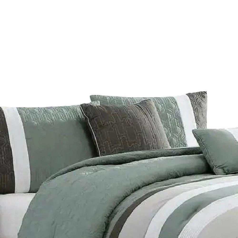 Impressively soft, gentle, and stylish, this five piece queen comforter set has a relaxing striped pattern in a color palette of green, gray, and white. Made from a microfiber cover with soft polyester filling, this set is machine washable and offers a refreshingly soft update to your bedroom decor. Check out our Owen collection for more options.