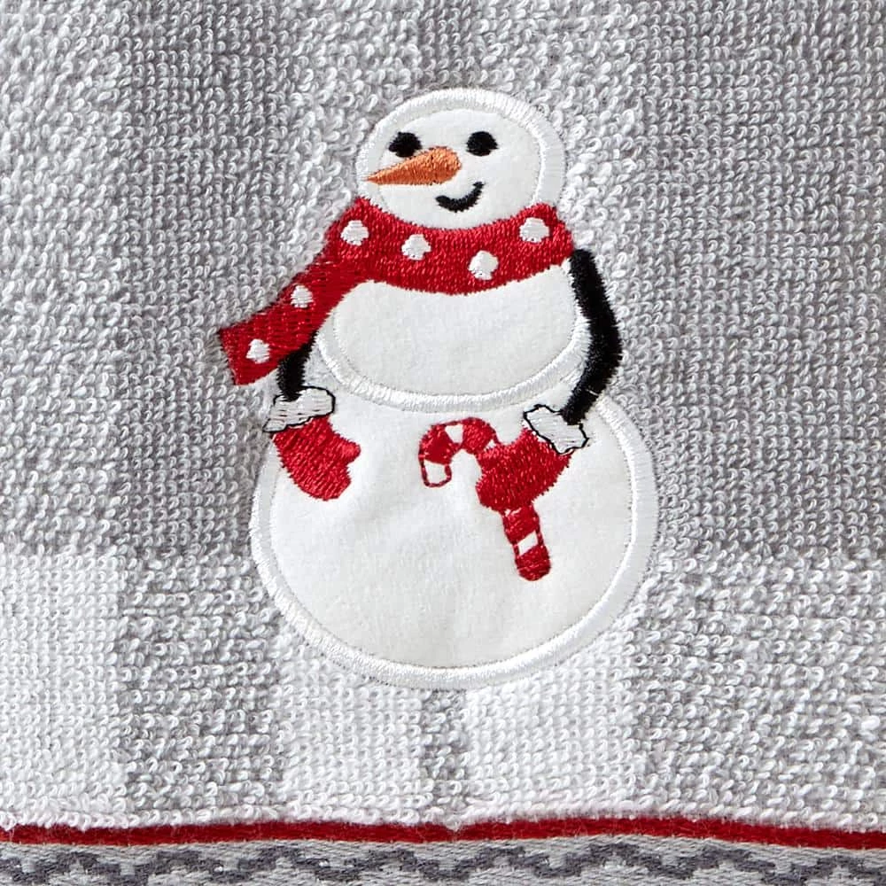 - Plaid terry design with a jacquard snowflake border and snowman embroidery