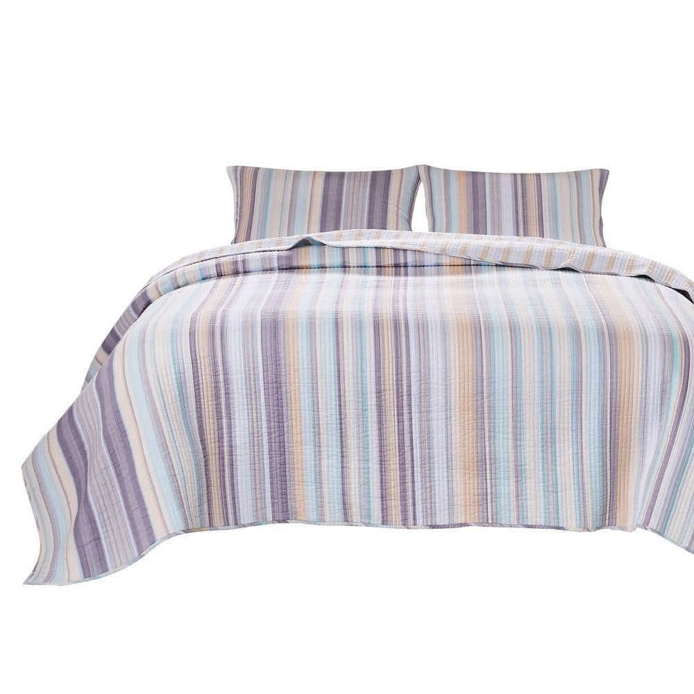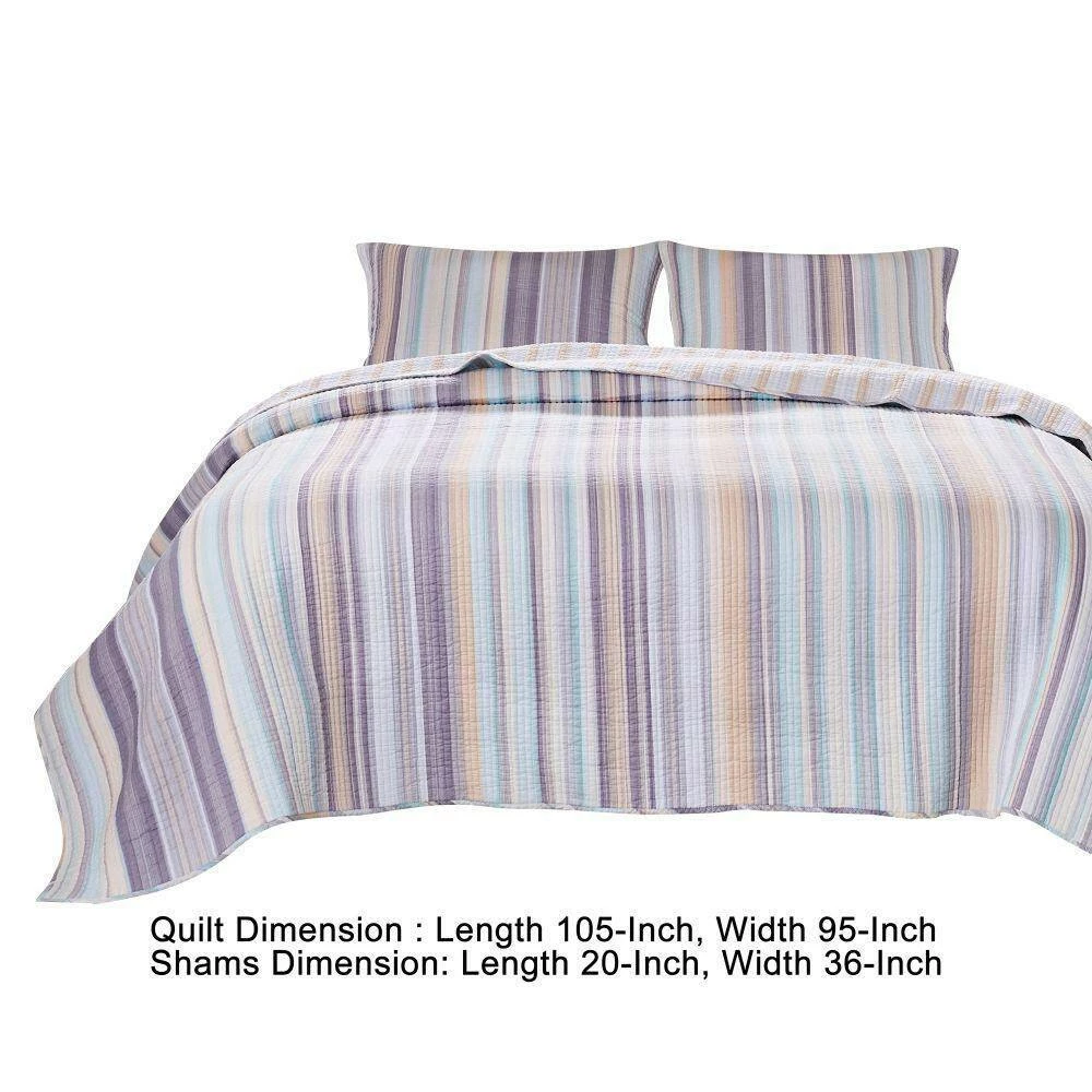 Subtle, classy and currently trending, this 3-piece oversized king quilt set makes a perfect fit for your master or guest bedroom. Crafted from an ultra soft cotton fabric, it depicts striped pastel pattern in the shades of turquoise, tan, charcoal, blue, ivory and white. Featuring 2 pillow shams, the set is machine quilted for lasting use. Check out our Ysa collection for more options.